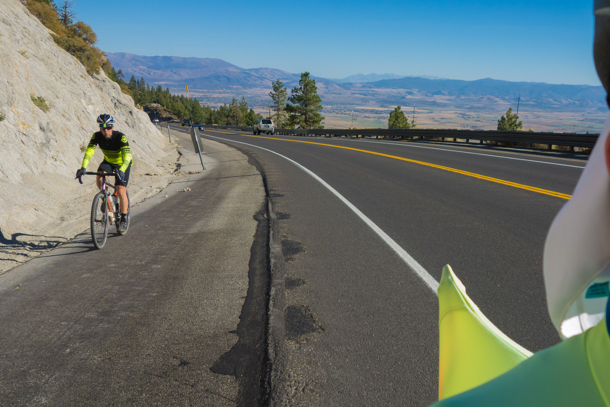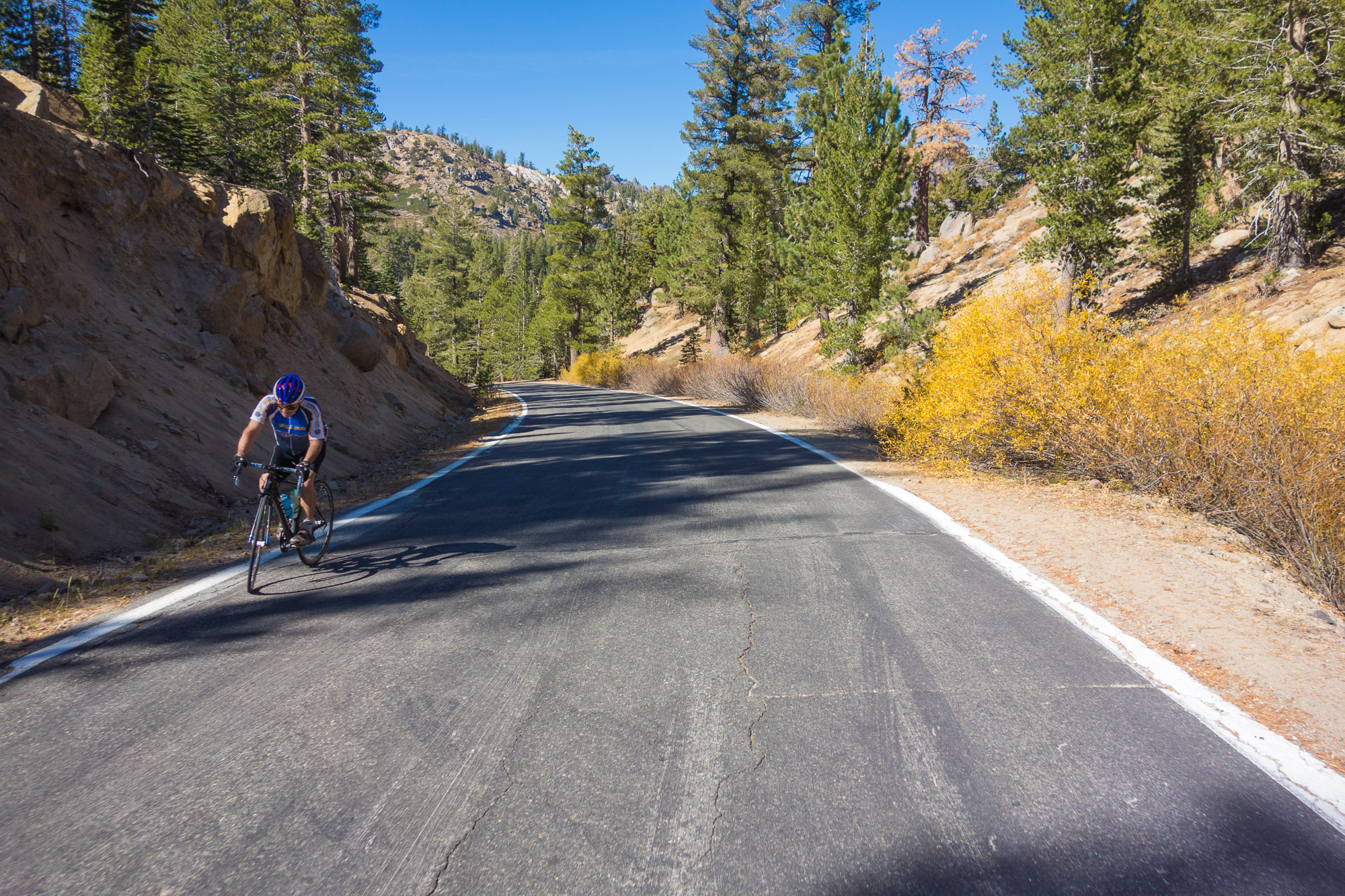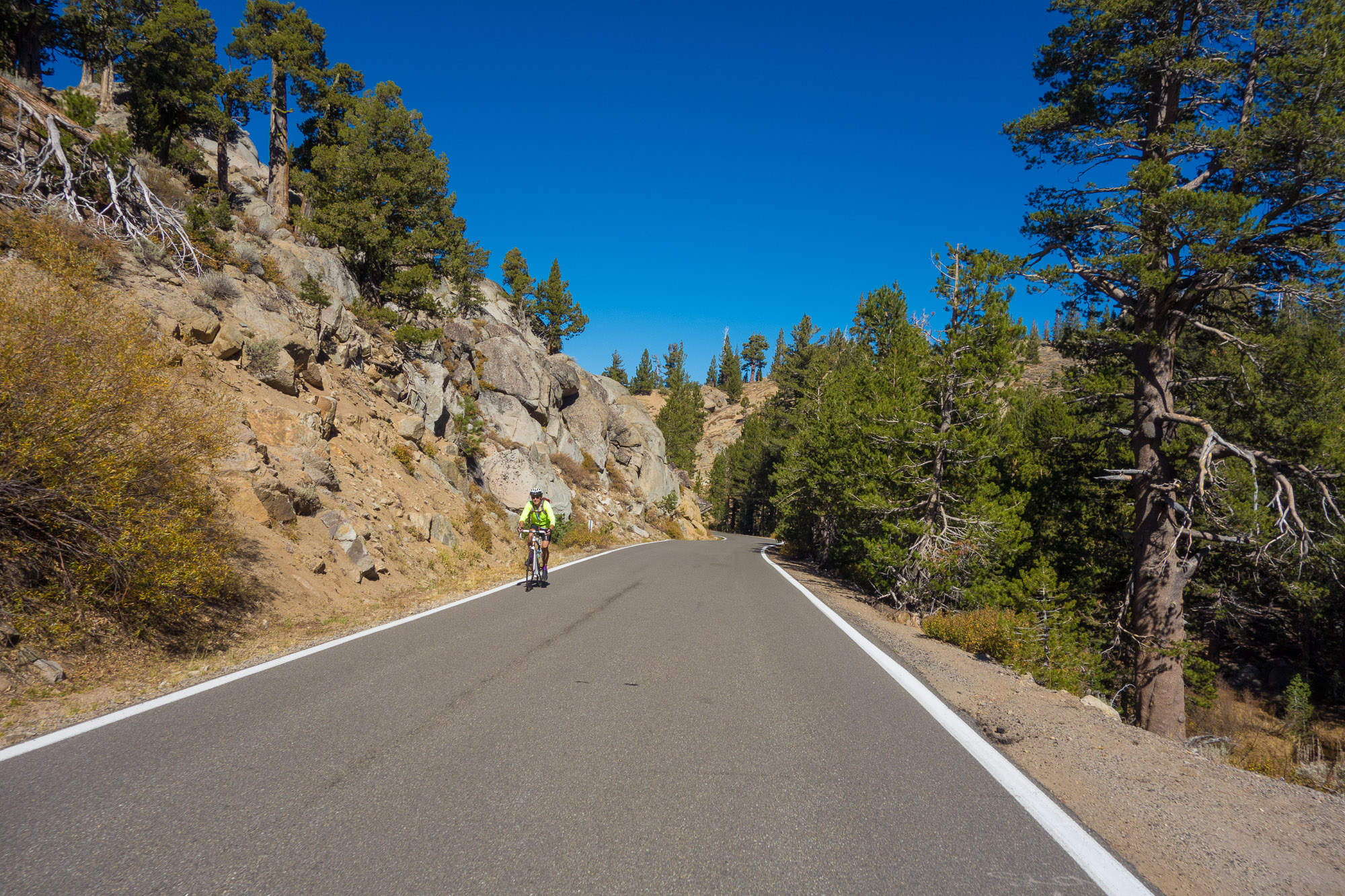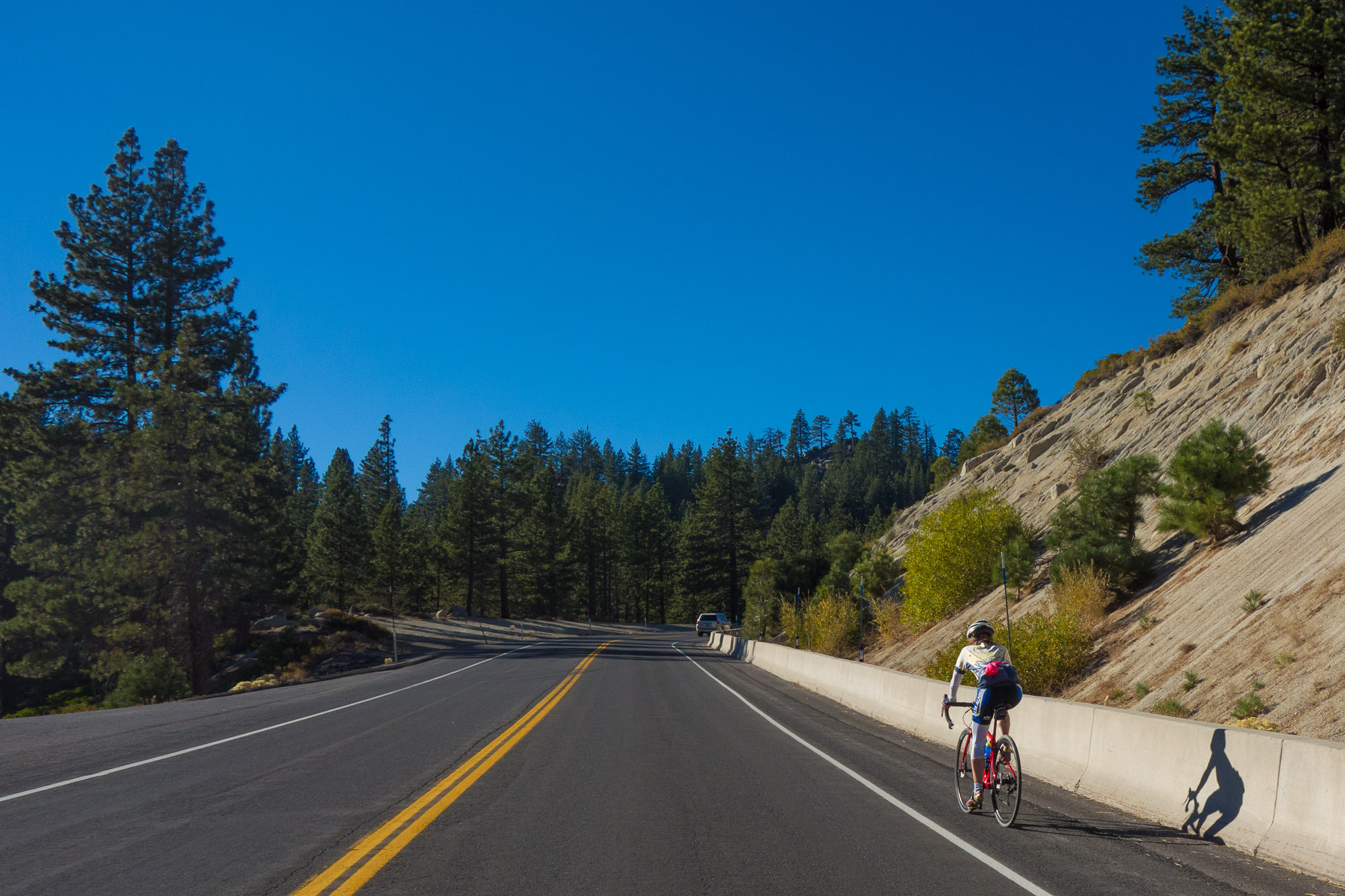 Cyclist on a gravel bike on Kingsbury Grade (east)