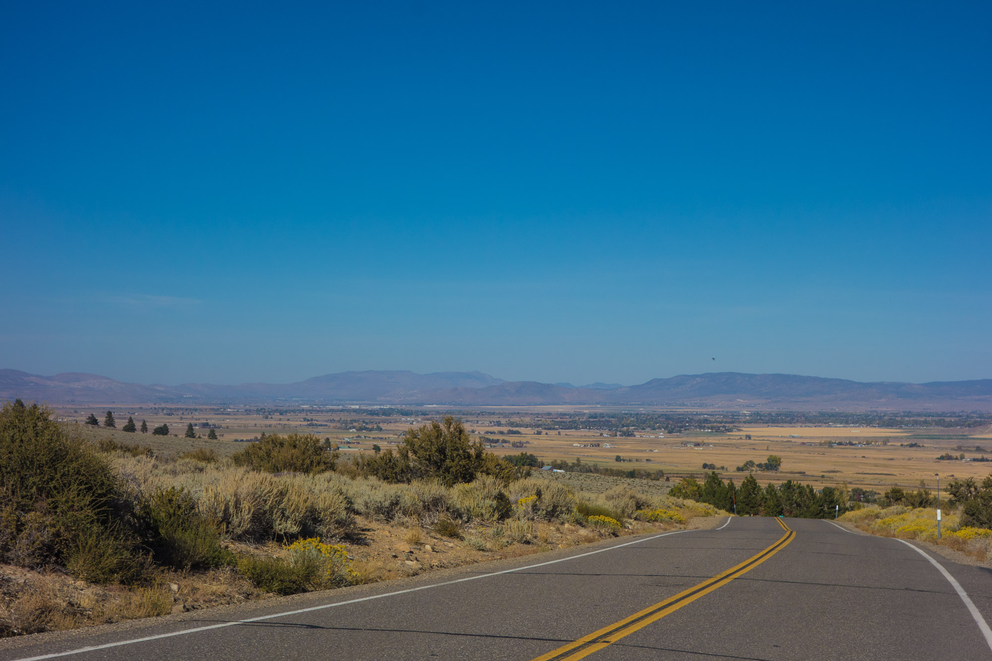 Carson City lies past the low hills at the north end of the valley at the left. Nearer at center and right are Minden and Gardnerville.