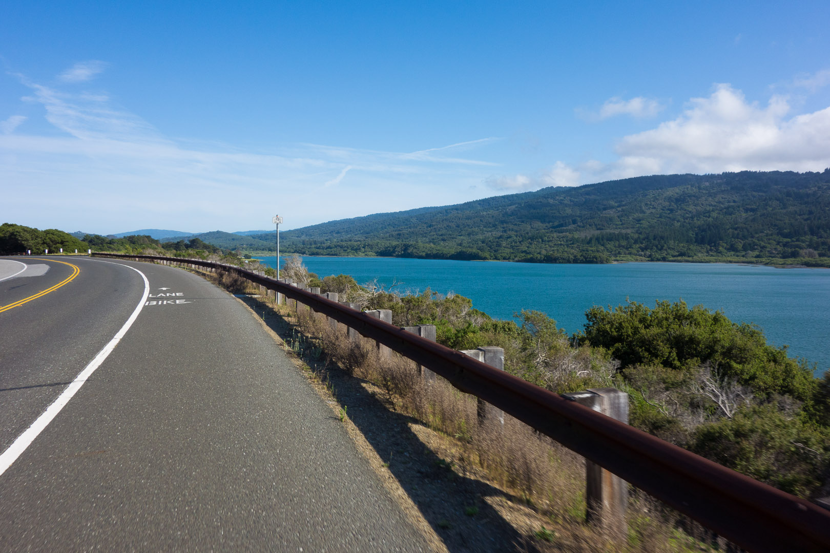 I have the road to myself next to a very full Upper Crystal Springs Reservoir.