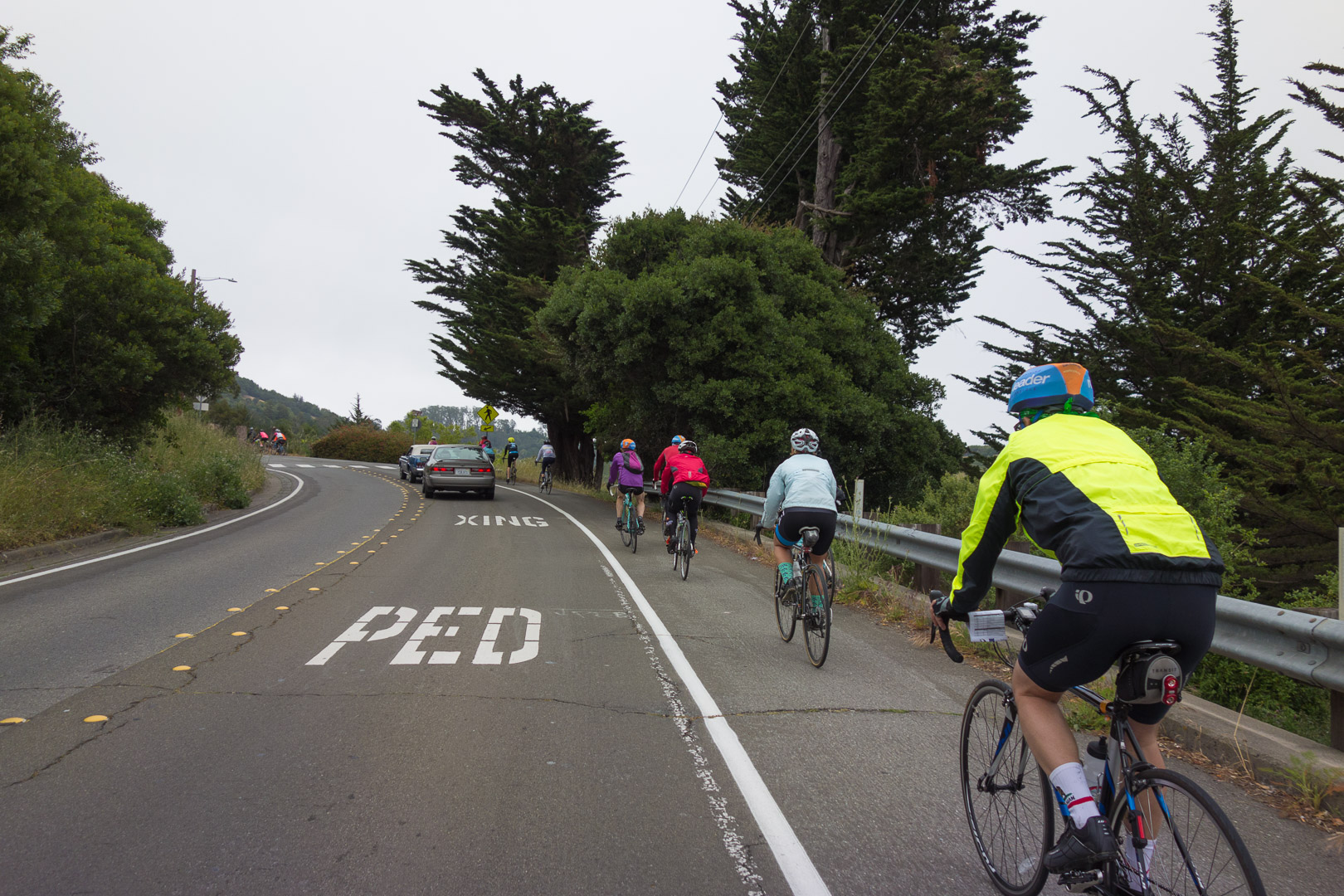 Cyclists and an impatient motorist on Camino Alto This density of cyclists was typical of my ride through southern Marin.