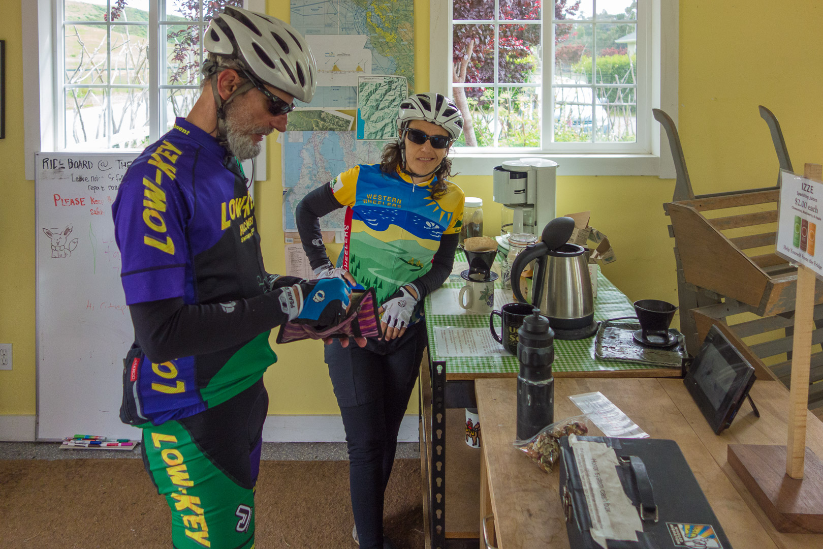 Stella manages half a smile while she waits for her coffee to percolate as Frank tenders a deposit to the till inside The Bike Hut.