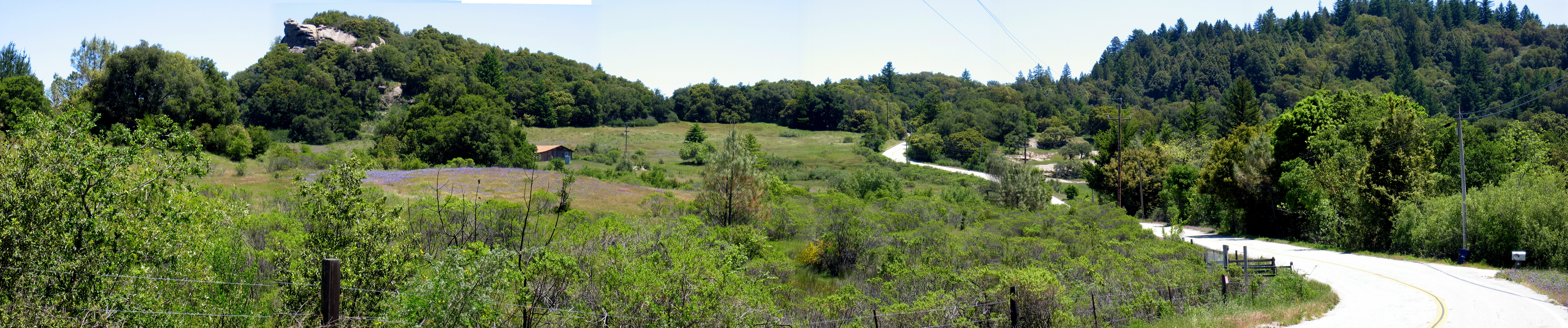 A panorama of the small valley beneath Eagle Rock near the end of Empire Grade Rd. Eagle Rock is off the frame to the left. The unusual sandstone outcropping on the left of the panorama is unnamed on the USGS 7.5min topo.