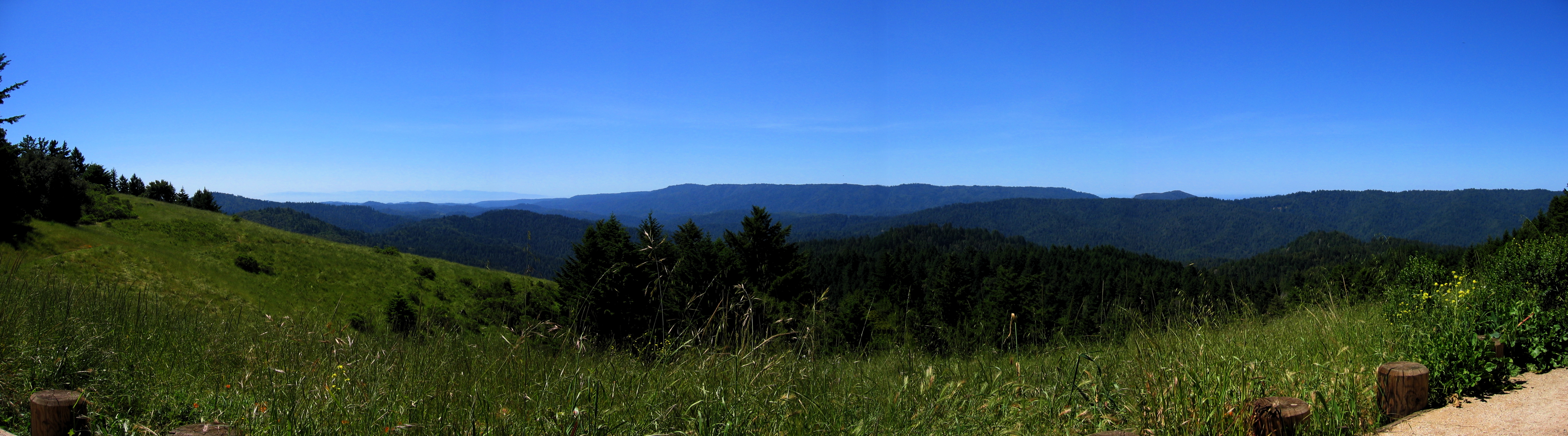 (l to r): In the far distance one can see the north end of the Santa Lucia Mountains of Monterey County and Monterey Bay. Ben Lomond Mountain (2650ft at the highpoint, along which runs Empire Grade Rd.) is the next distant ridge to the right (and much closer). Pine Mountain (2280ft) stands by itself to the right of Ben Lomond Ridge, separated by the Scott Creek drainage. In front of Pine Mountain one can see the southeastern end of Butano Ridge. The visible watershed all drains into the San Lorenzo River.