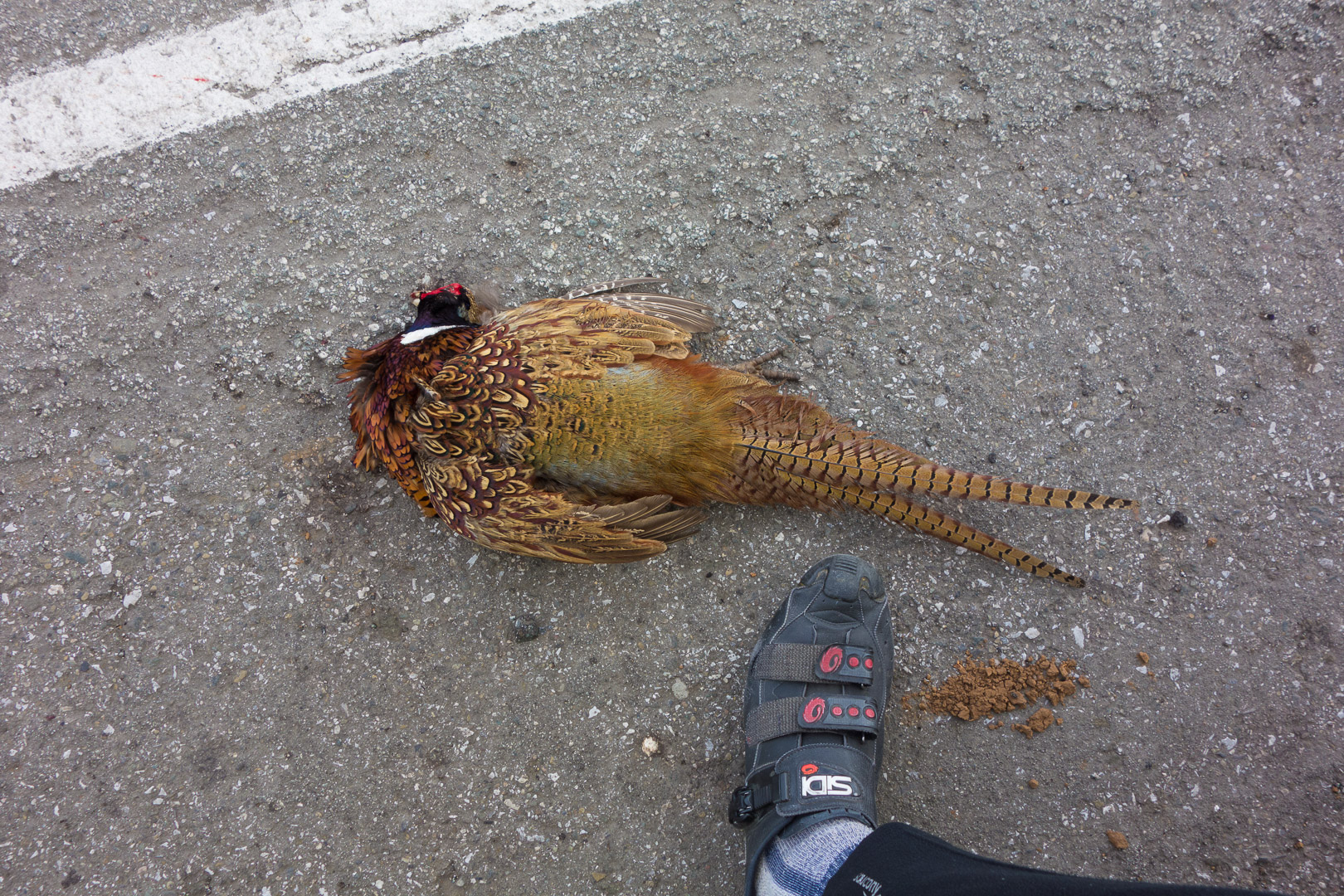 A dead pheasant lies in the bike lane on Monterey Highway.