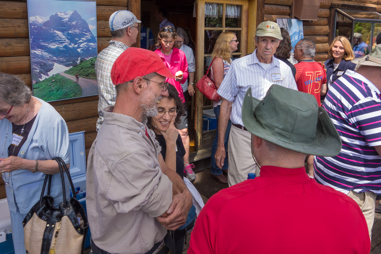 Frank Paysen, Stella Hackell, and John Serafin (back to camera) share a story.
