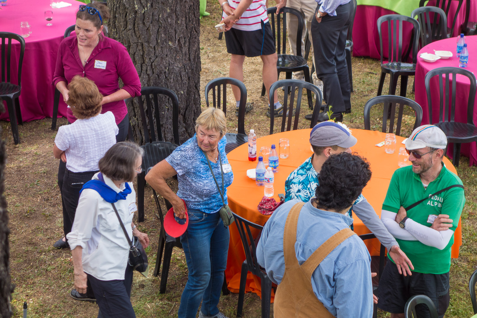 Three Conversations (upper left): Jan Johnson and Jeanie Barnett, Hermi Hiatt and Helga Brandt (lower left), and Chalo Colina, Don Pardo, and Jack Newlin (lower right)