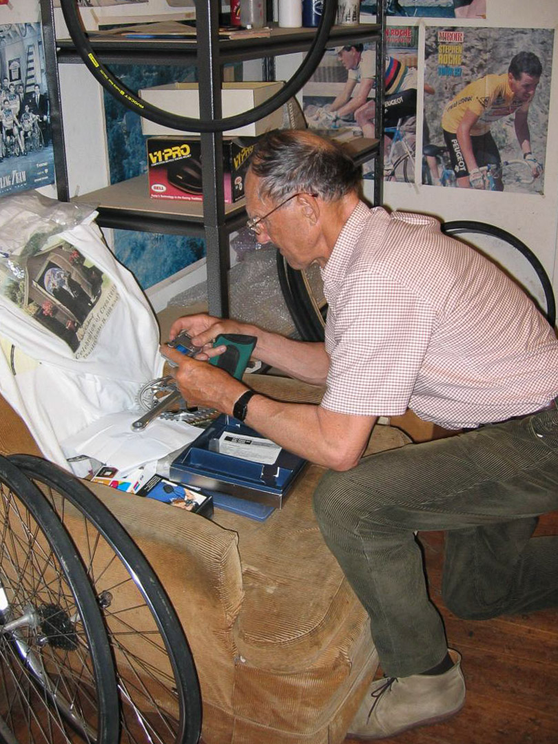 At lower left are Jobst's wheels that use hubs and spokes dating to the 1970s. The Avocet tire hanging on the rack failed early and was apparently one of the tires manufactured in IRC's subcon facility where according to Jobst quality control was substandard. The Bell V1-Pro helmet seems an unlikely accessory for Jobst. Jobst was fond of collecting tools, water bottles, and other accessories that he found on the road. Photo courtesy of Don Pardo.