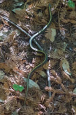 A garter snake slithers off the trail.
