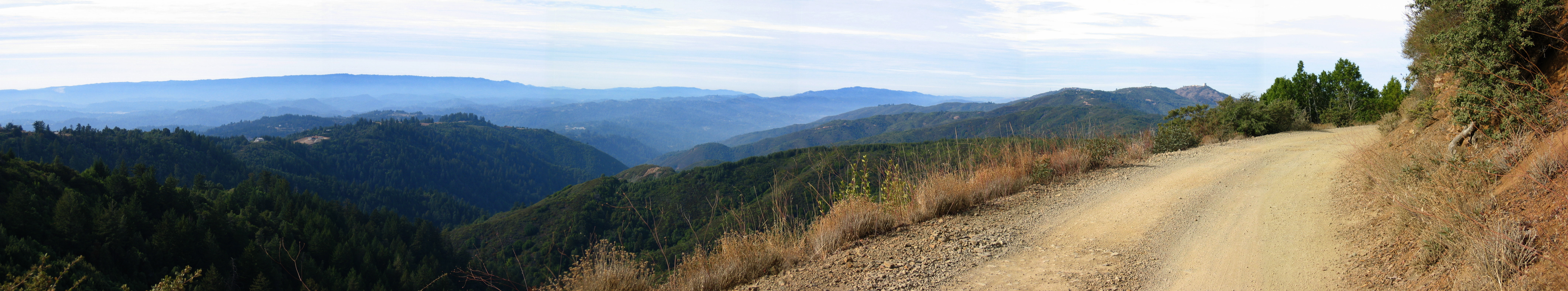 (l to r): In the distance we can see Ben Lomond Mountain (2600ft). Closer we can see the top of the ridge lower Loma Prieta Ave. ascends. The deep canyon before us is that of Los Gatos Creek. The mountains to the right are the Sierra Azul. To the right we can see Mt. Thayer (3480ft), the weather radar dome (3450ft), and Mt. Umunhum (3490ft). The road in the foreground is Loma Ridge Rd.
