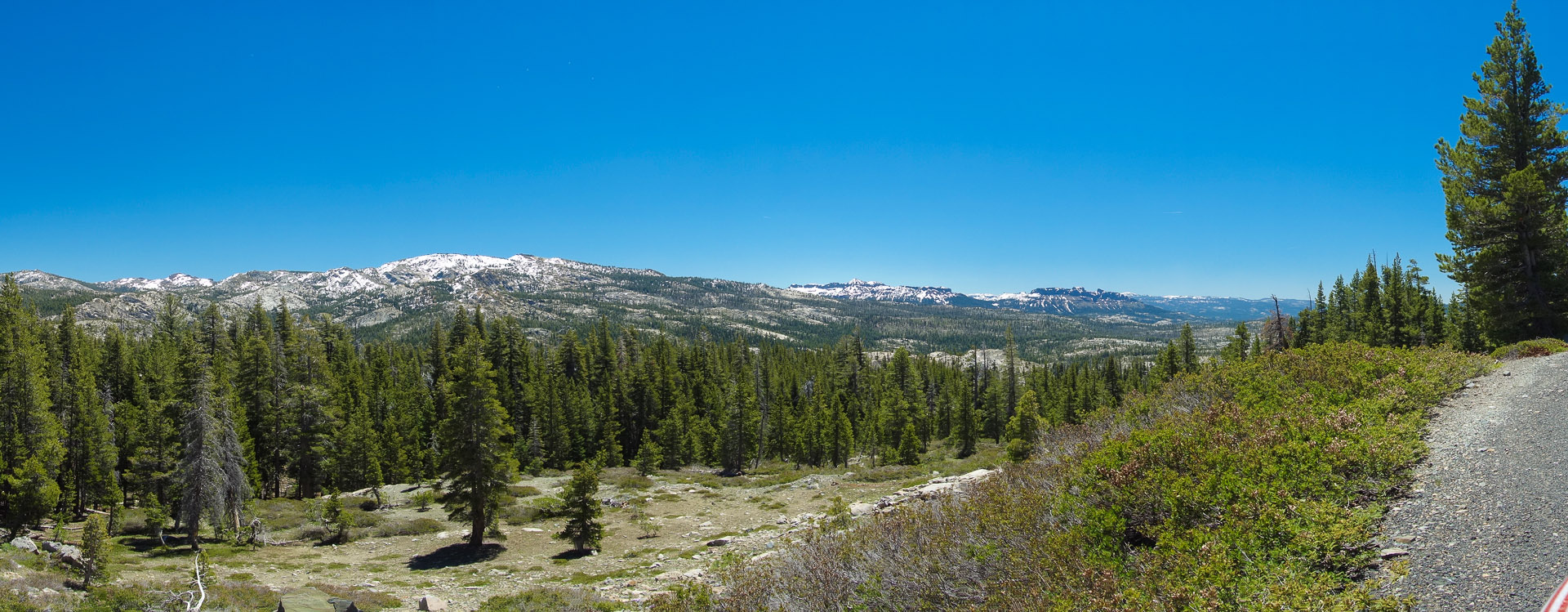 Panorama south from Cape Horn (l to r): Bull Run Peak (9495ft), Airola Peak (9942ft), Leavitt Peak (11569ft) in the distance (and the high point in the photo) above The Dardanelles.