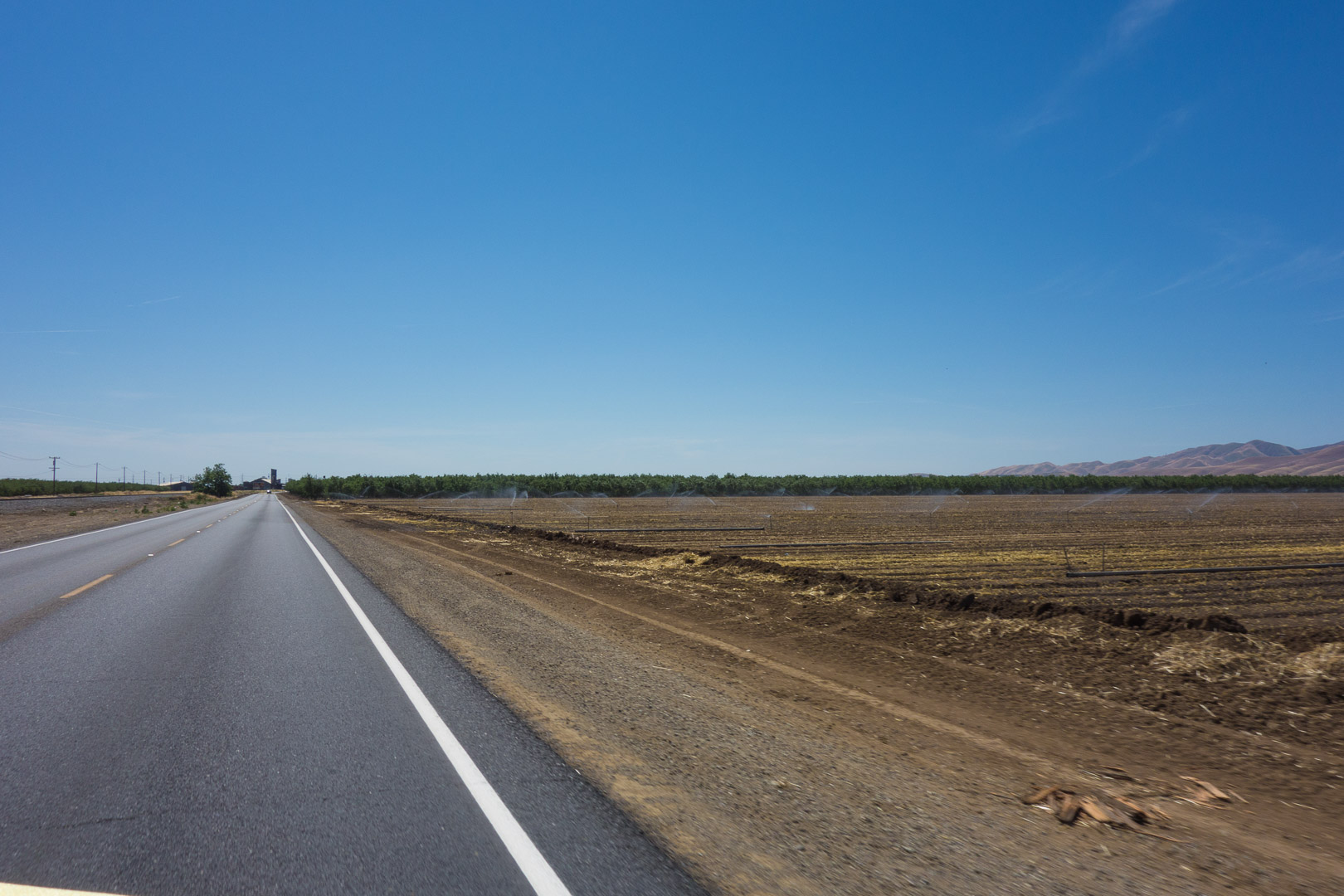Sprinklers water a brown field in the middle of the day.