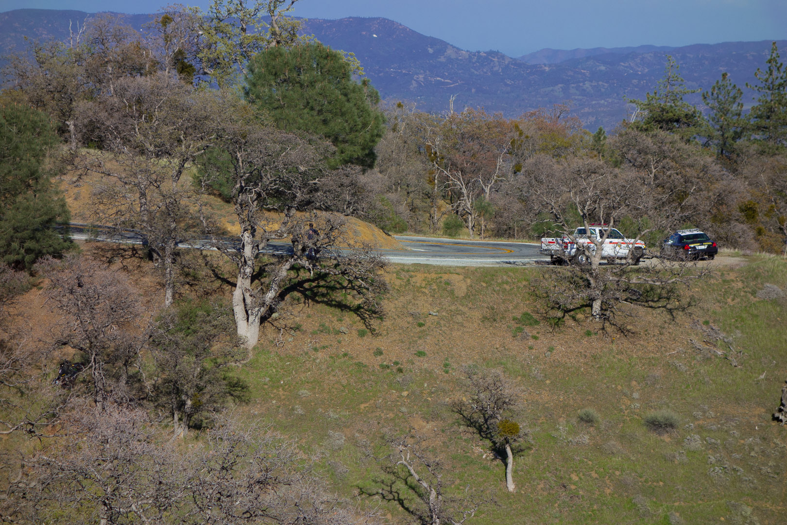 It's hard to see what happened in this photo. The wrecked motorcycle lies to the left of the large oak at the center-left of the photo. A CDF Firefighter and a CHP officer are standing by the road behind a branch of the same tree. The motorcyclist is not present. It appears the motorcyclist couldn't hold the curve while traveling uphill.