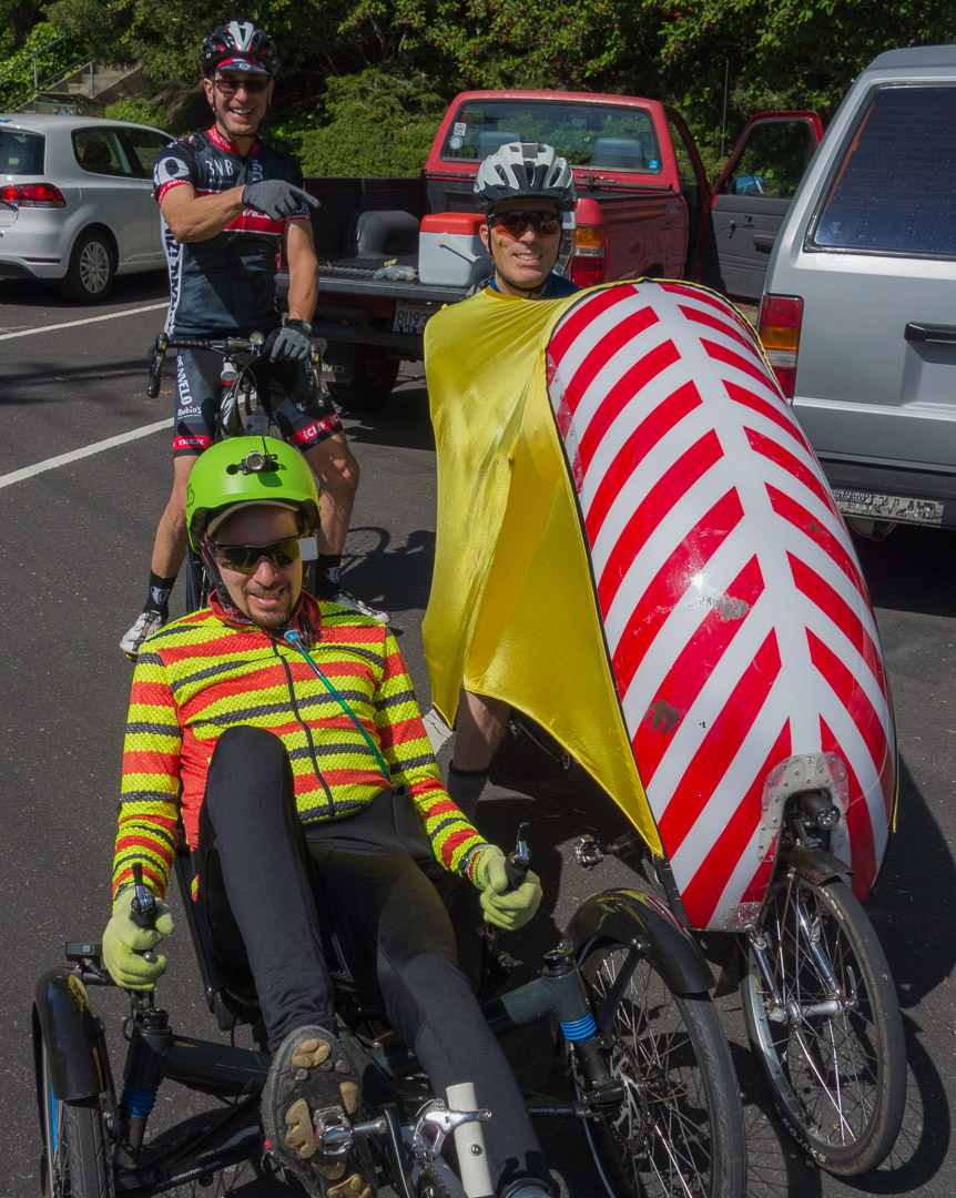 Photo at the end of the ride Zach (l) and Bill. Bill Harkola points out the more ridiculous-looking of the two.