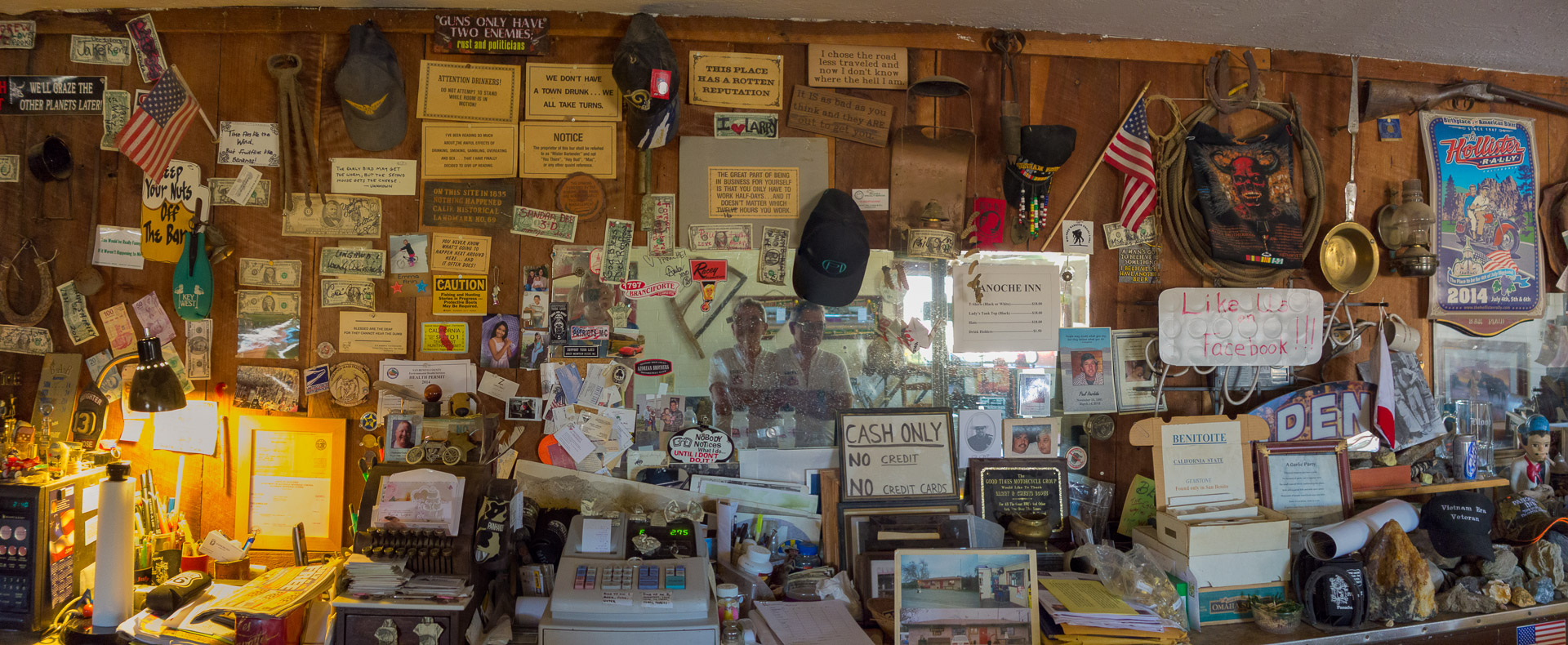 Wall behind the bar at the Panoche Inn Open the image in a separate tab or window to read the signs.