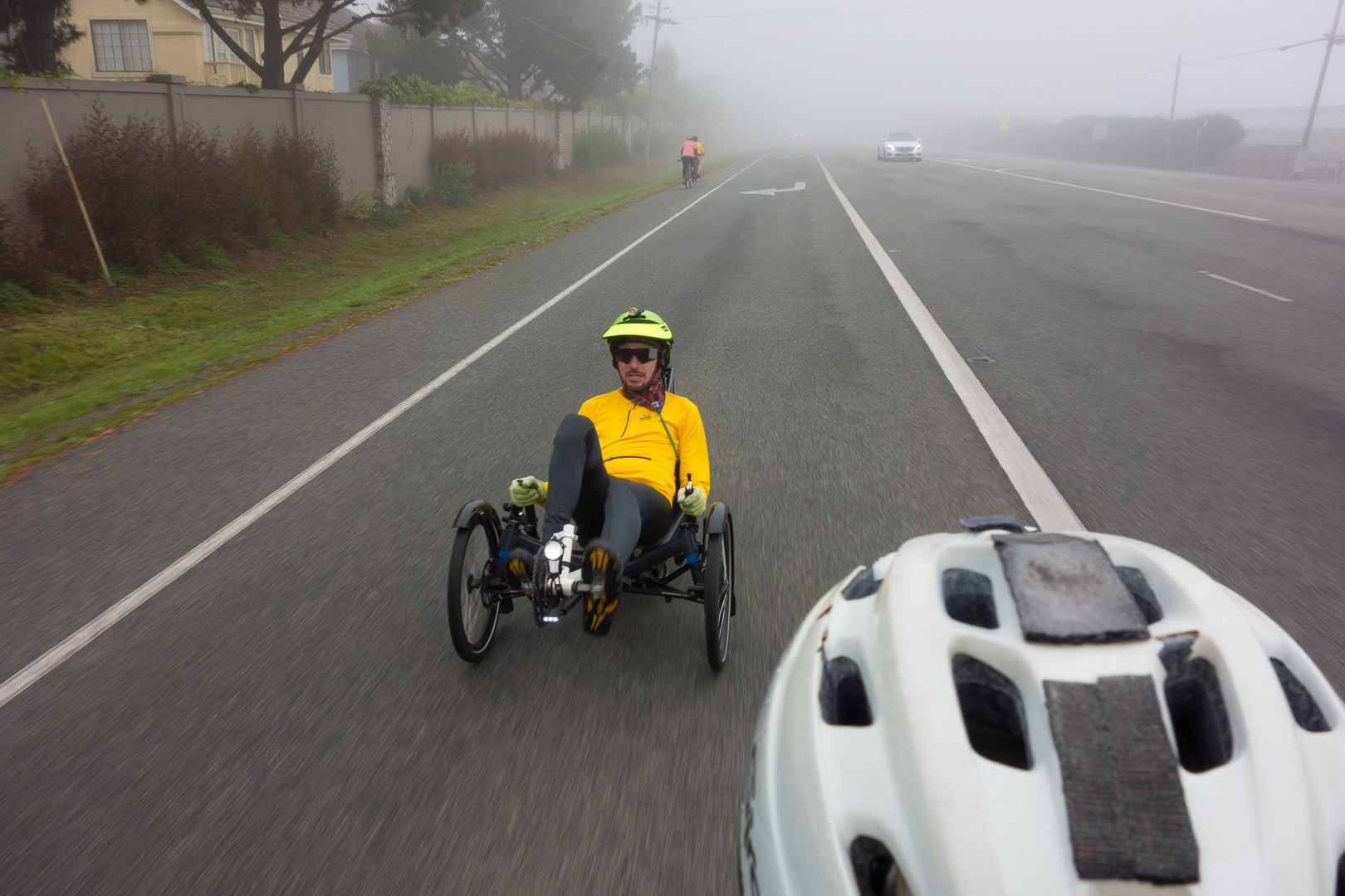 Zach zips along through the fog on CA1 in Half Moon Bay.