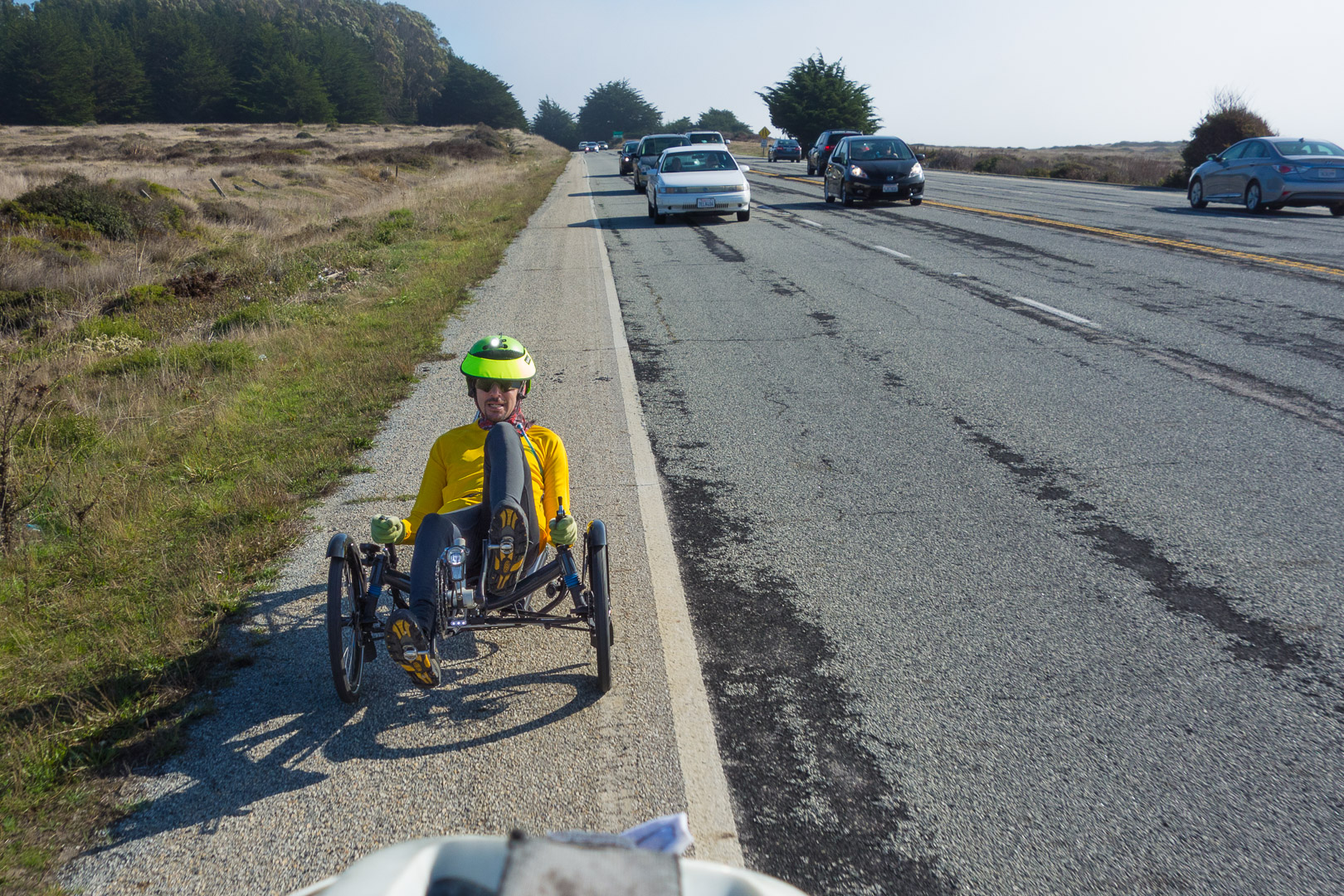 Zach and heavy traffic on CA1 near Gazos Creek