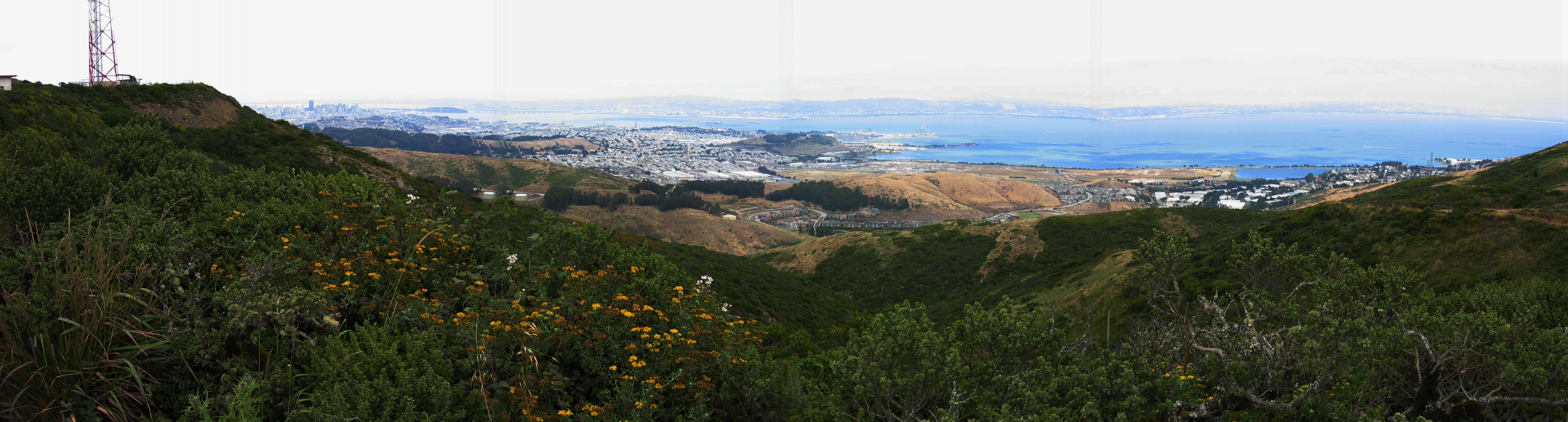 From the left we see the base of one of the TV transmitter antennae. Downtown San Francisco appears rather small in the background. The Bay Bridge and Yerba Buena Island are to the right. Hunter's Point and Visitacion Valley lie to the right. Candlestick Point (a.k.a. KYA Hill) are to the right. One can just make out Candlestick Park. At the far right is Brisbane.