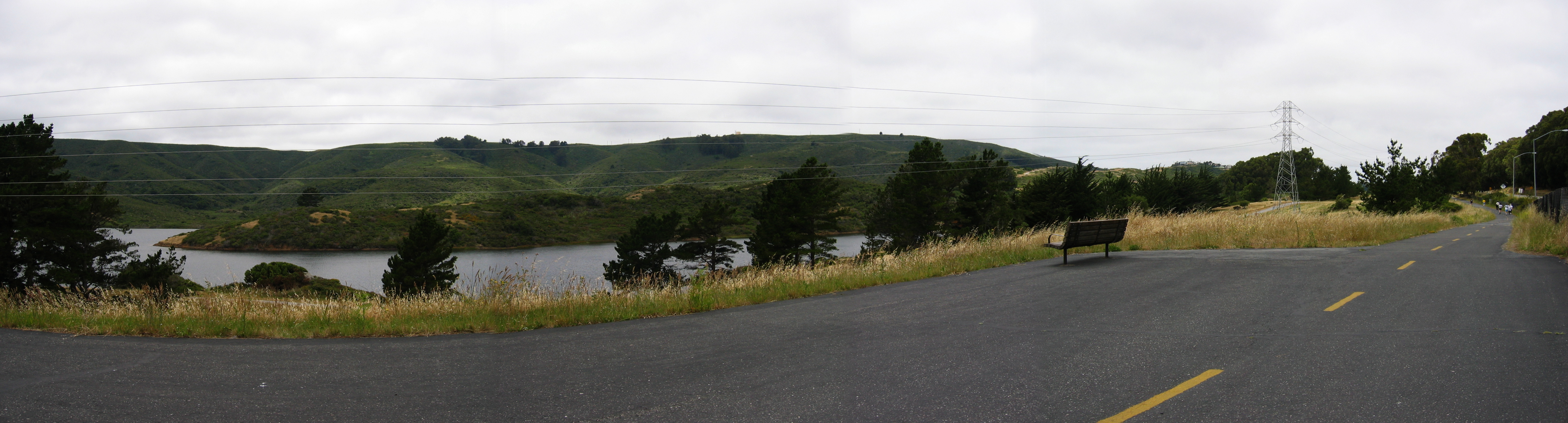 This view can be enjoyed along the San Andreas Trail between Larkspur Drive and San Bruno Ave.. The view to the west is of the northern section of San Andreas Lake and Sweeney Ridge. The power lines are PG&E.