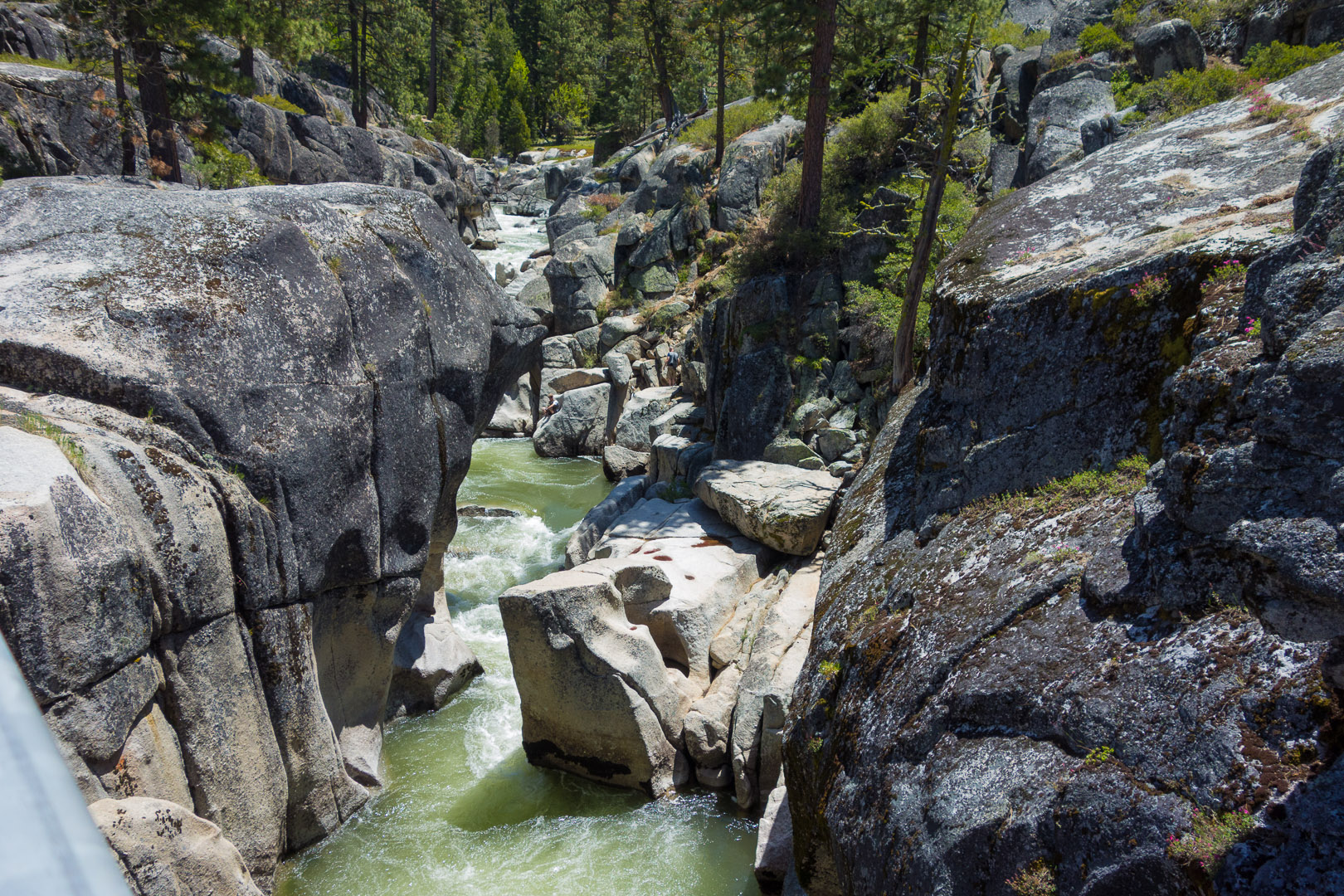 Middle Fork Stanislaus River roars through a rocky defile beneath the road bridge. Can you spot the two people precariously perched on the rocks below?