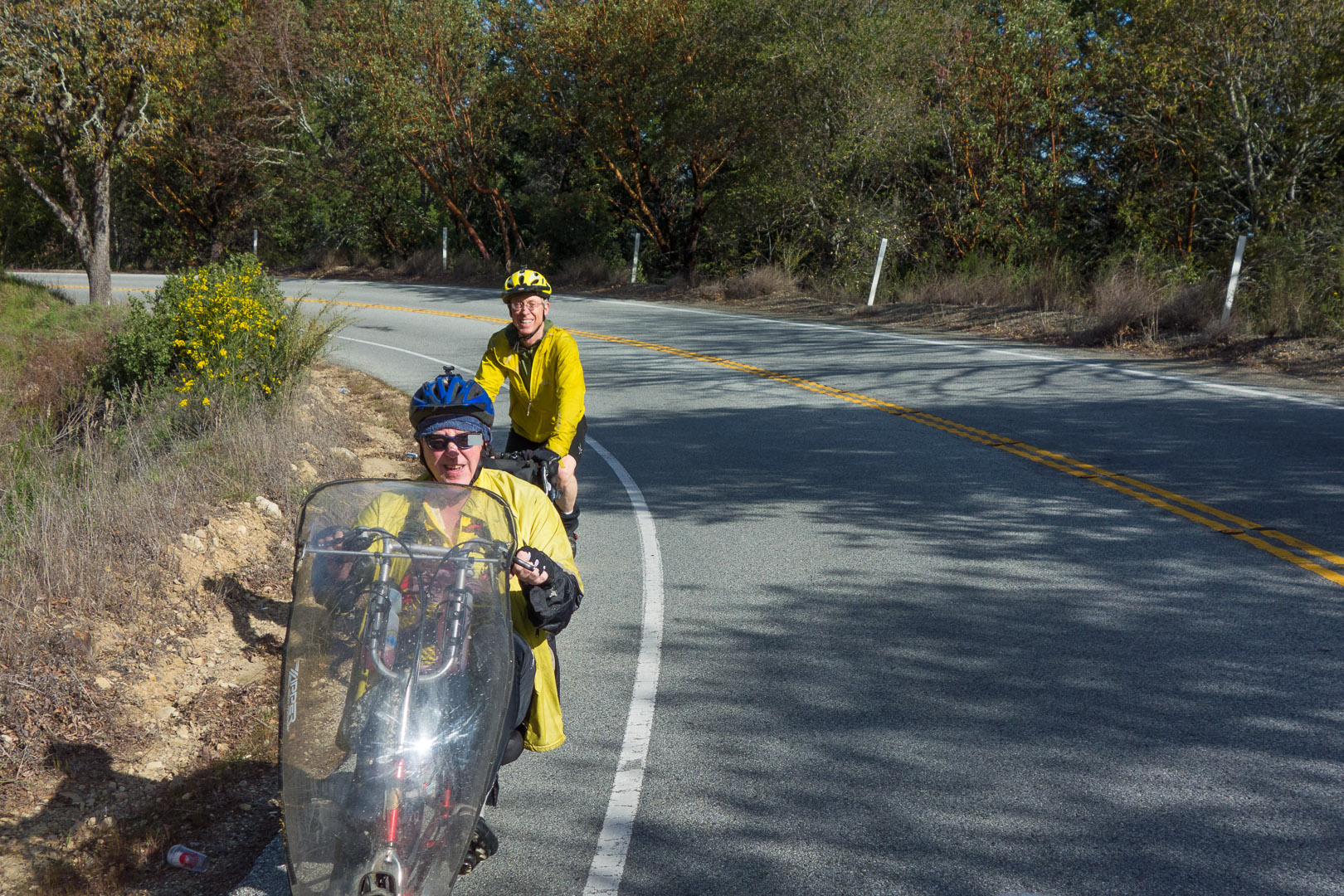 Two cyclists, one on a faired Tour Easy, climb CA9 from Saratoga.
