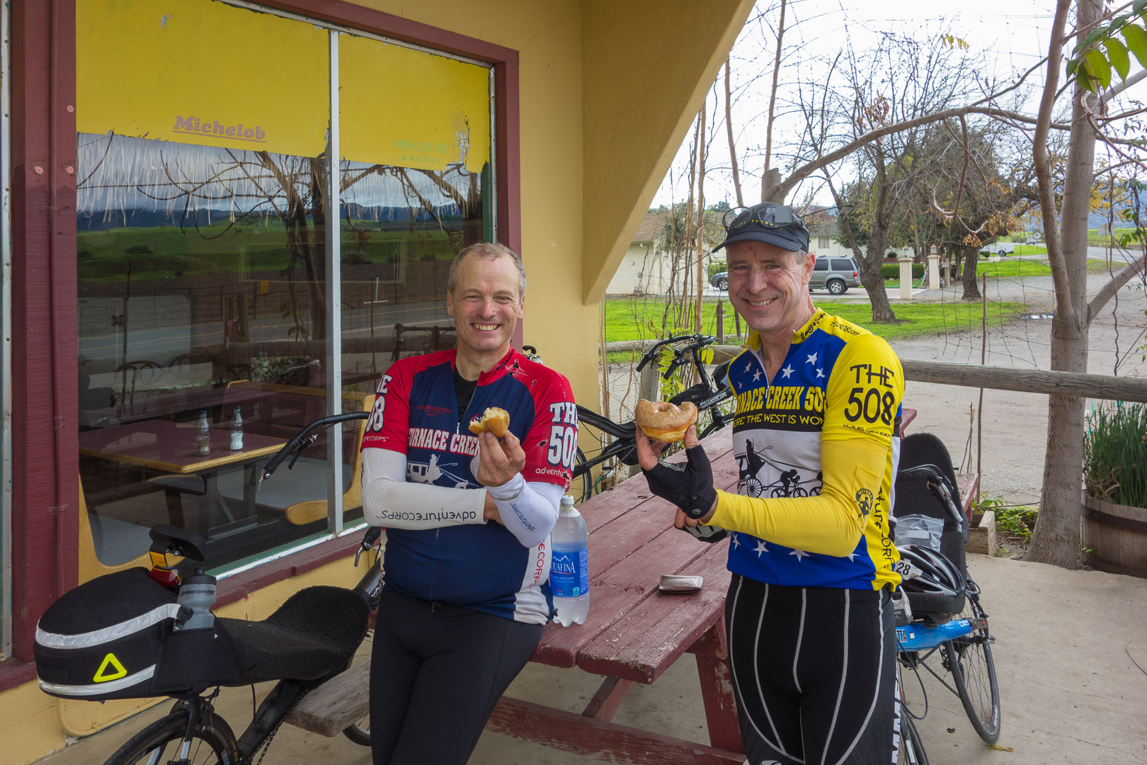 Tim Woudenberg and Jim Kern eat their mid-ride snack at Paicines Store.