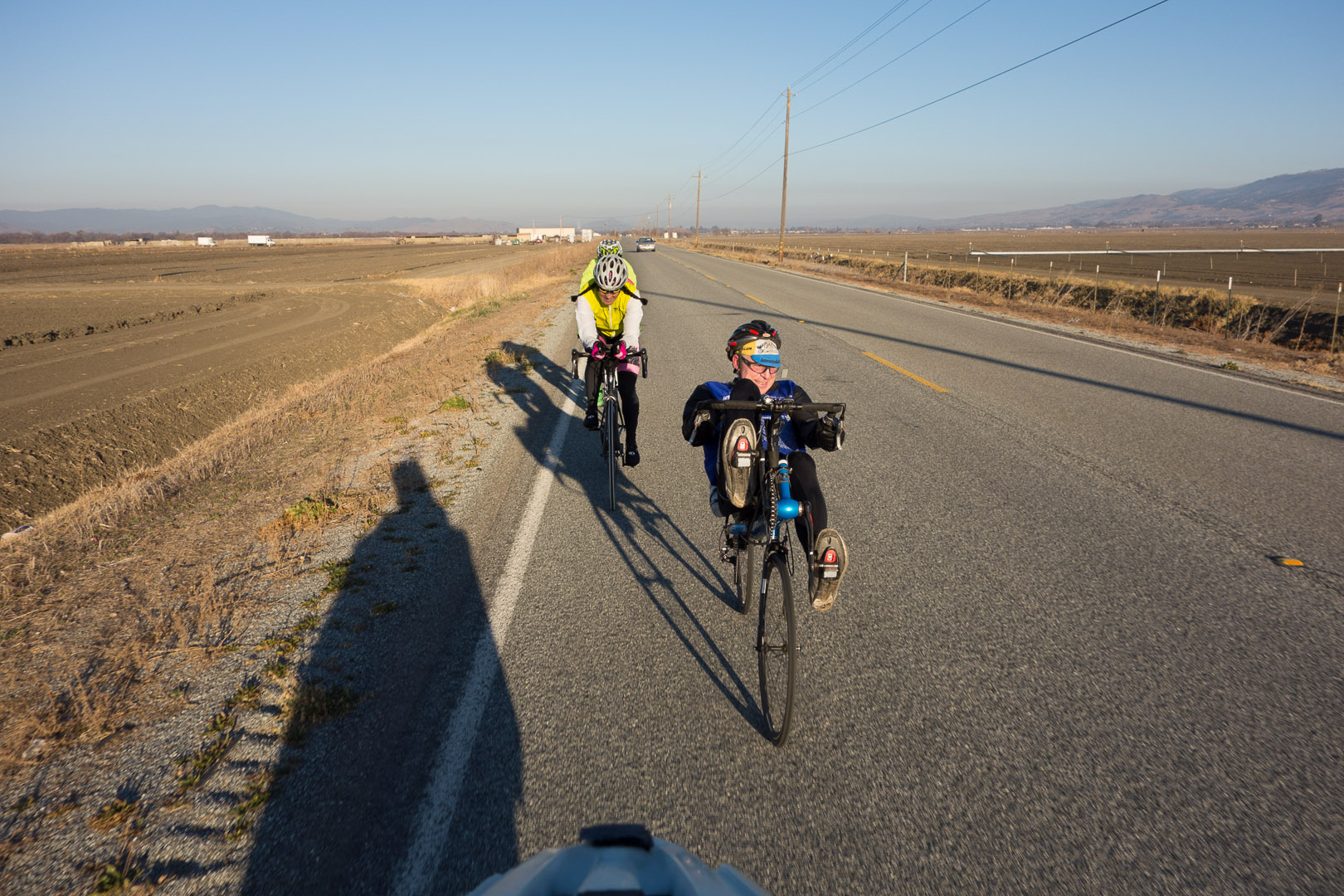 Jim checks for overtaking traffic.